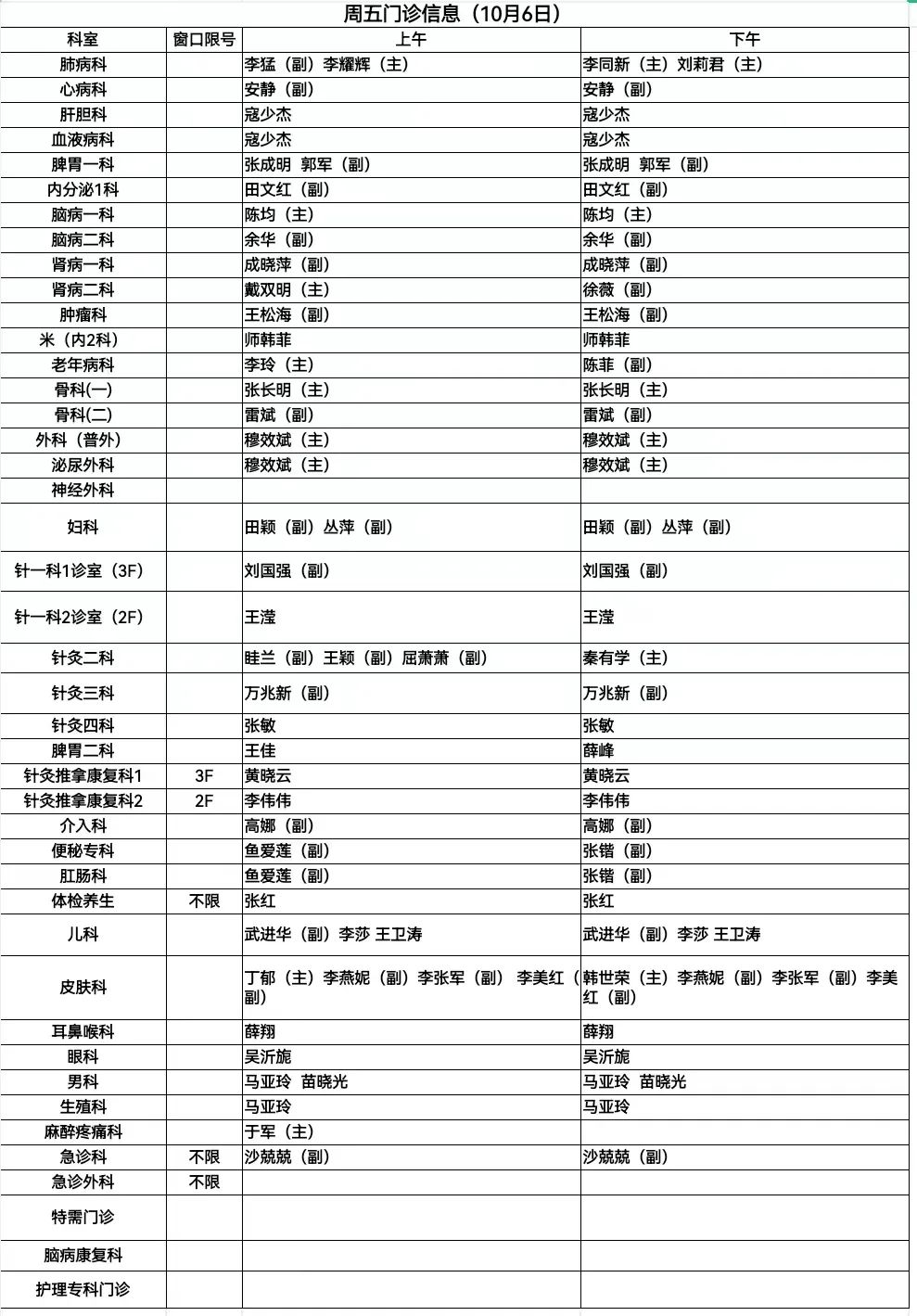 陕西省中医医院门诊信息(10月4、5、6日)