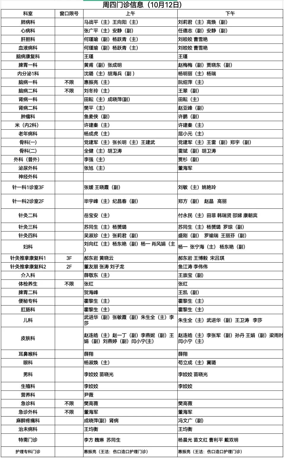 陕西省中医医院门诊信息(10月11、12、13日)